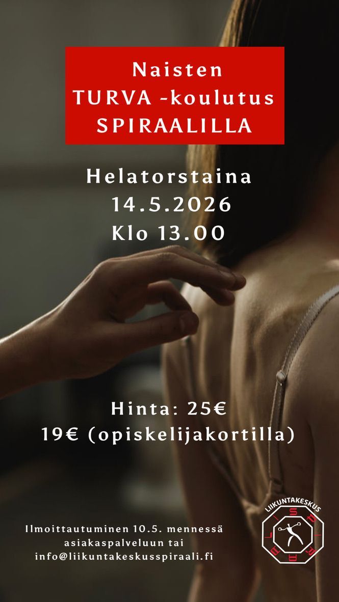 Naisten TURVA-koulutus tarjoaa hyödyllisiä käytännön oppeja, kaiken ikäisille naisille, tunnistaa uhkatilanteet ajoissa, toimia itsevarmasti ja suojella itseään arjessa. Tule harjoittelemaan ja oppimaan selkeät irtautumis- ja itsepuolustustekniikat, tilanteiden ennakoinnit sekä rauhoittavan vuorovaikutuksen keinot ammattitaitoisen kouluttajan opastuksella.