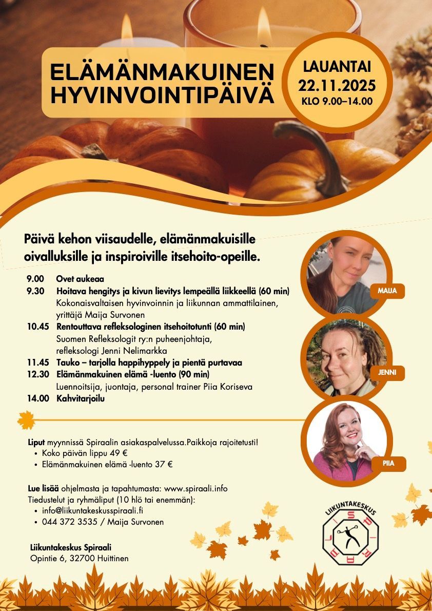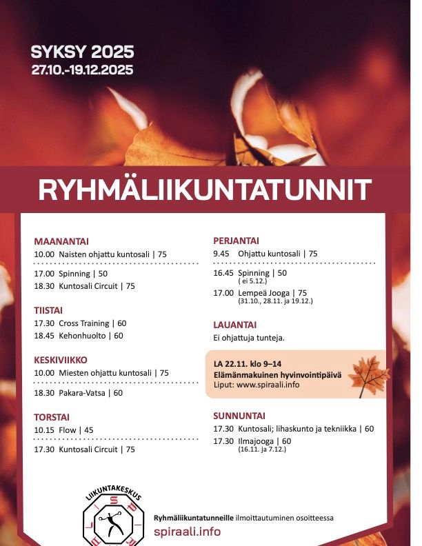 Kauden ryhmäliikuntaohjelma on suunniteltu niin aloittelijoille kuin konkareillekin; voit tehdä liikkeet oman kunnon ja voimien mukaan. Mikäli sinulla on selkä, polvi, olkapää- ym. vaivoja, voit kysyä ohjaajalta sinulle sopivia vaihtoehtoliikkeitä.